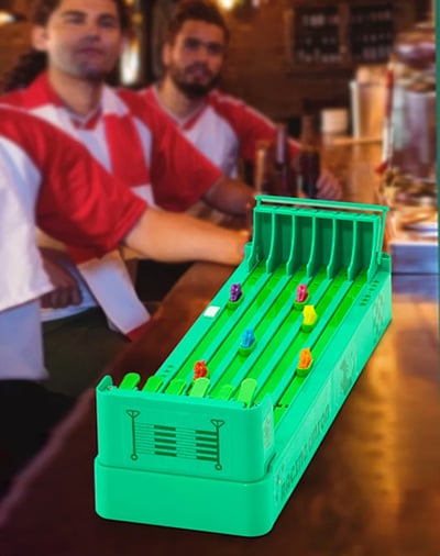 We first played this game at a bar and were looking for it to have at home. We keep it on our bar and love to play it when hosting friends. I’d recommend it!