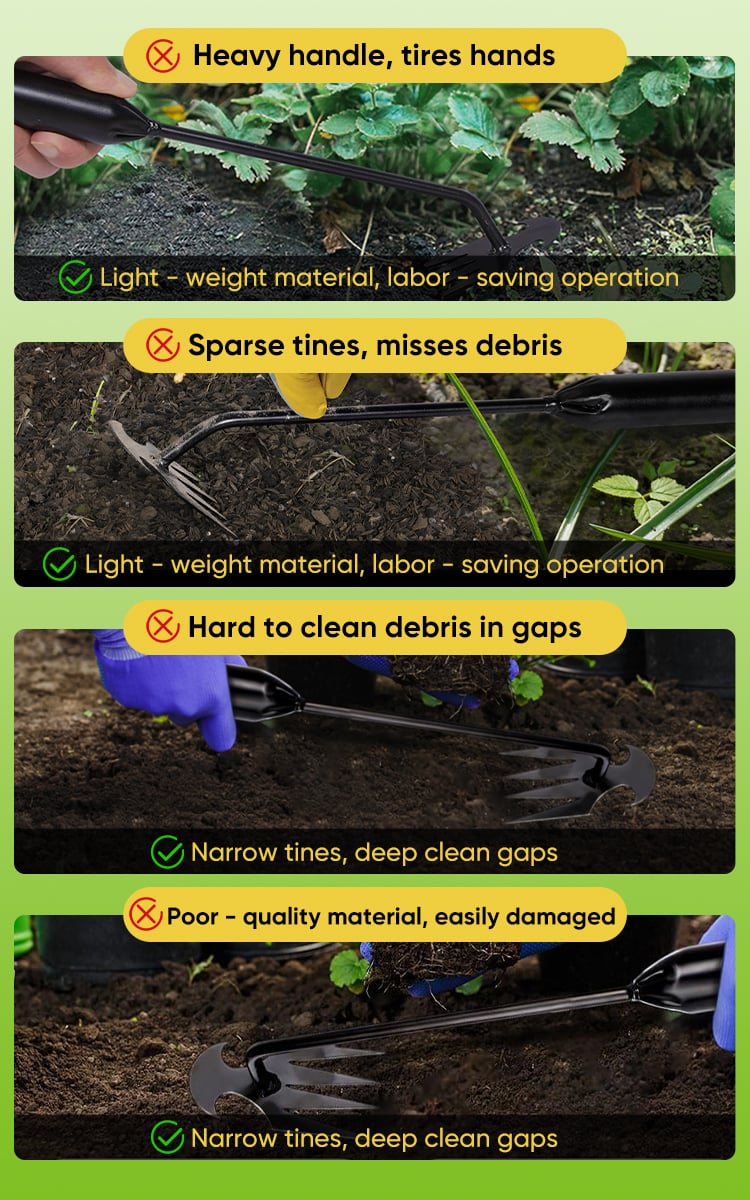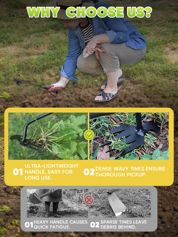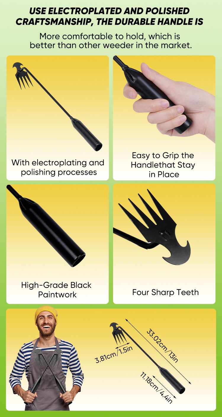I'm getting older, and bending over to pull weeds is really ex-hausting. This weeding tool is a life saver! Just stand and step on it, and the weeds come out with the roots. lt's so effortless