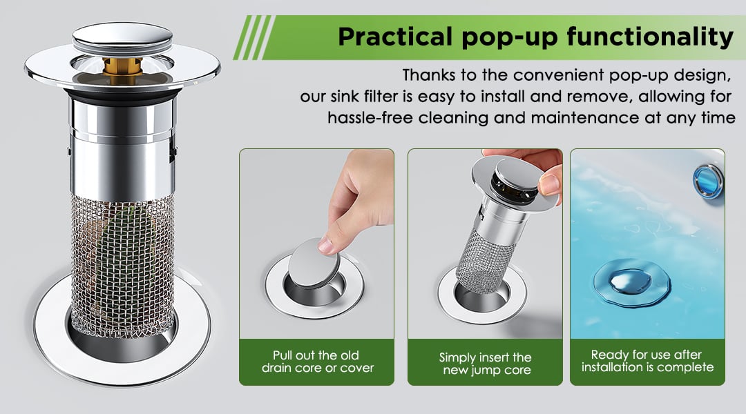 Thanks to the convenient pop-up design, our sink filter is easy to install and remove, allowing for hassle-free cleaning and maintenance at any time without the need for complex tools or techniques.