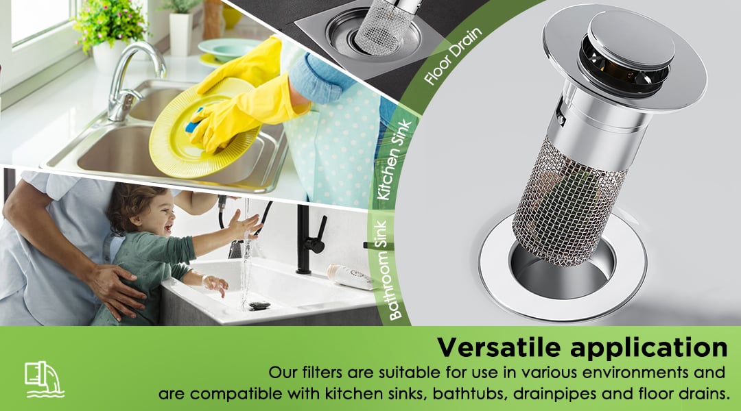 Suitable for use in various environments, our filters are compatible with kitchen sinks, bathtubs, drain pipes and floor drains, offering versatile solutions to keep your drains clean and functional in any area of your home.