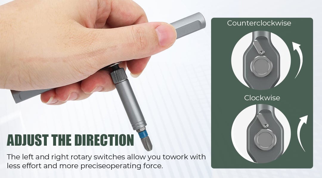 Effort-saving ratchet design, forward and reverse adjustment, screws in tight spaces, quick switching between long and short bits.