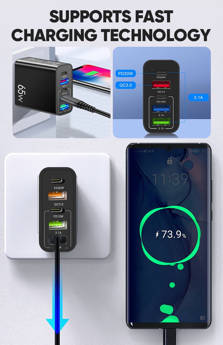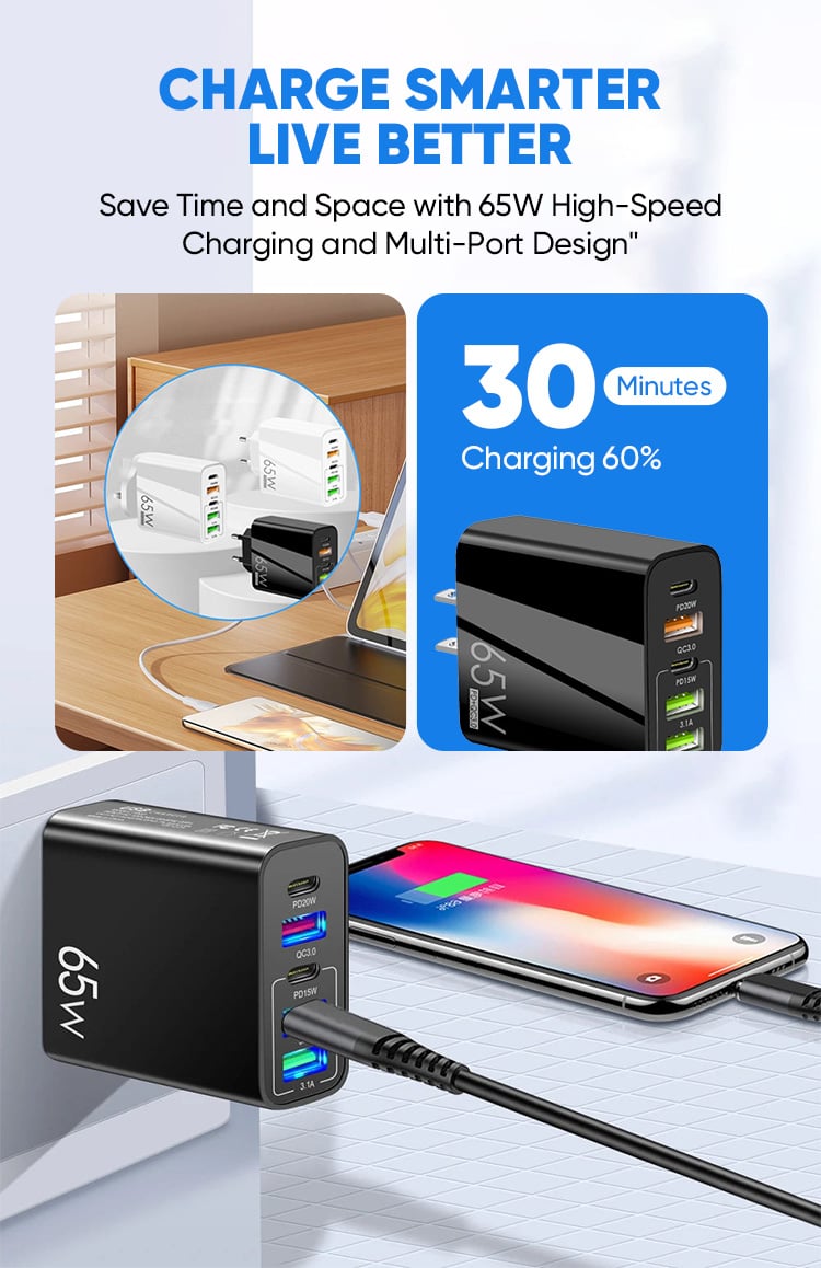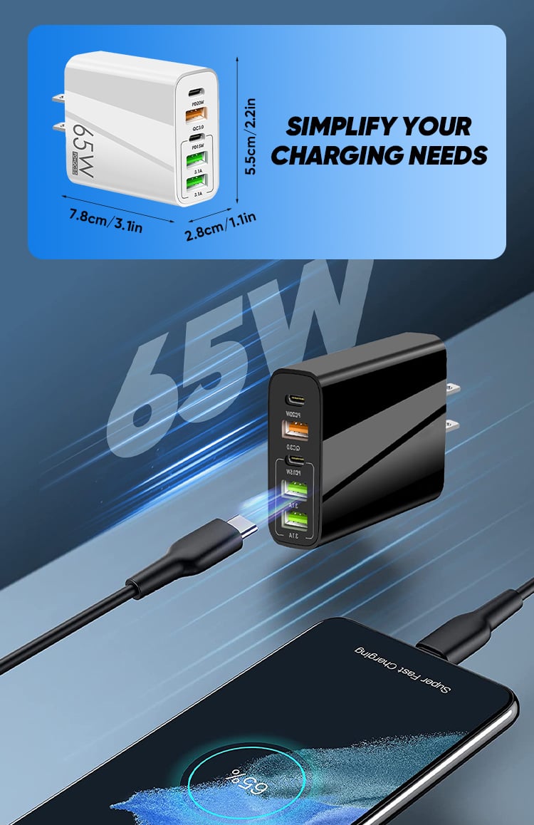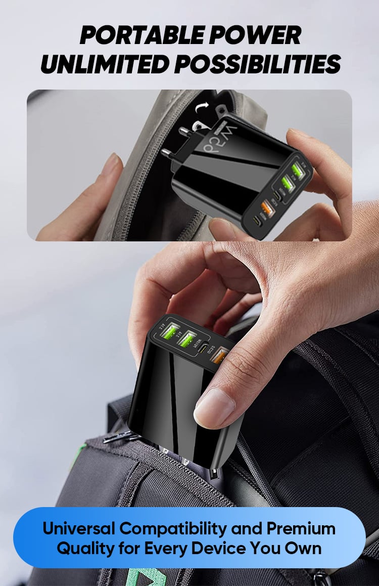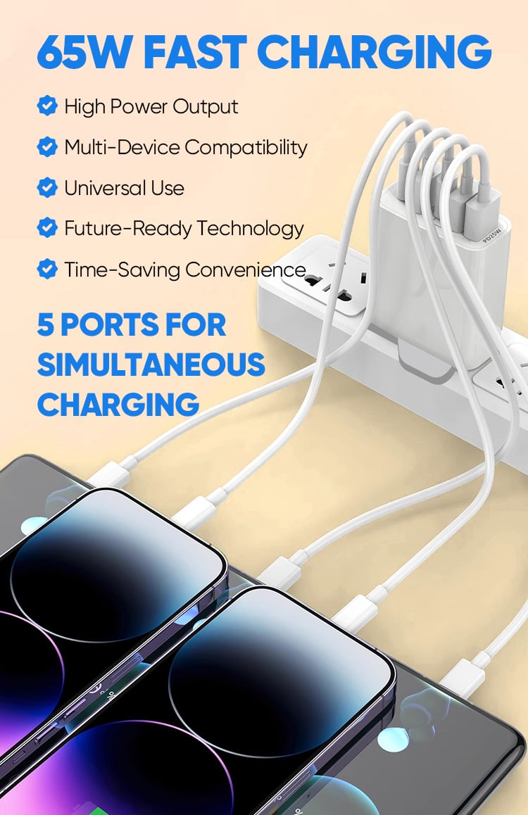 Charge up to 5 devices simultaneously with a compact, travel-friendly design.