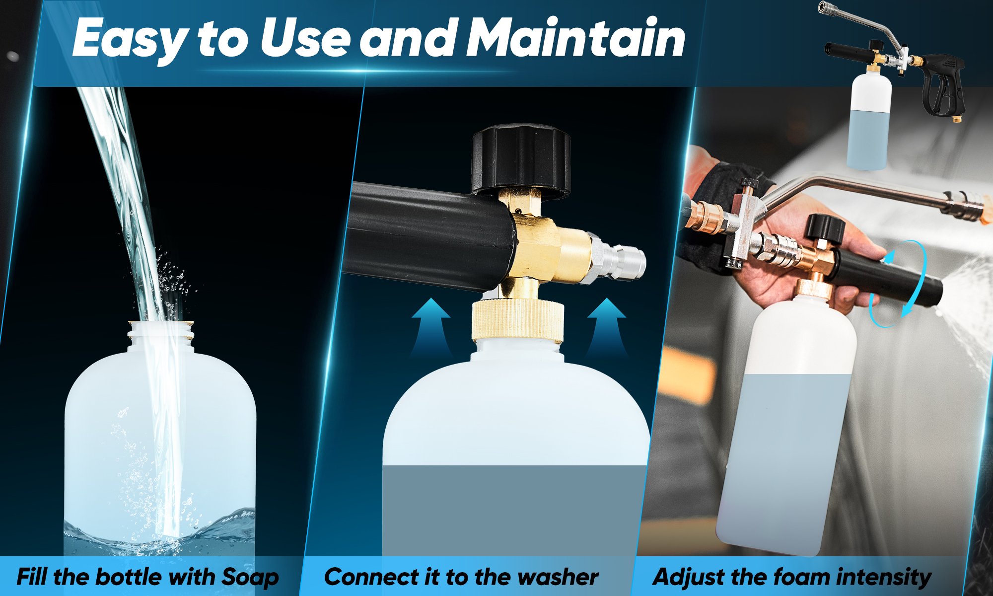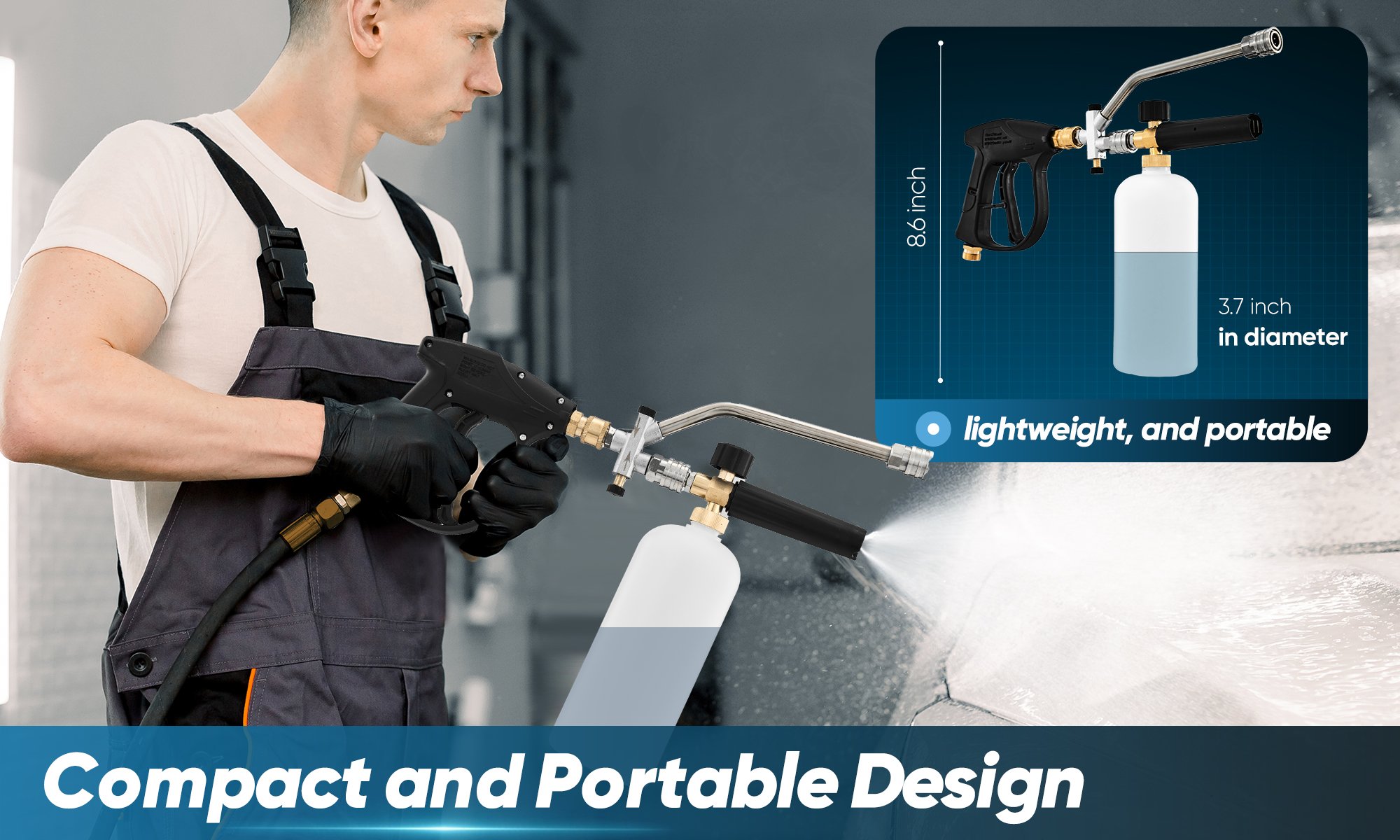 "Great foam cannon! It's easy to use and produces a thick foam that covers my car completely. The adjustable knob is a great feature and it's perfect for my car wash needs!"