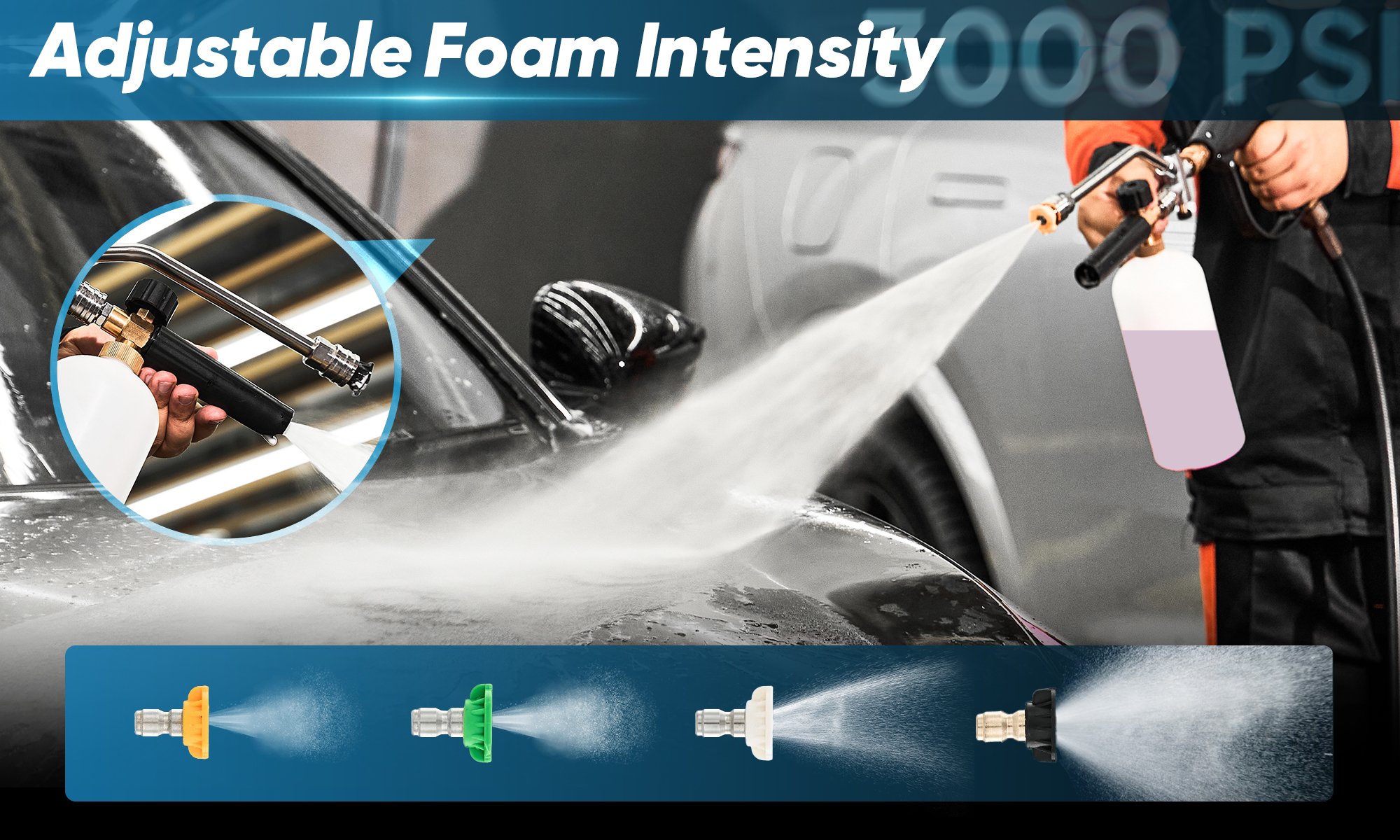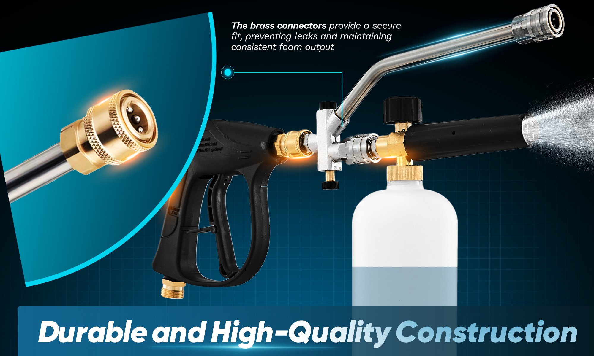 You know how annoying it is when you can't hook up your gear because the connectors don't match? This bad boy has that covered. It fits pretty much any pressure washer you have, making it the ultimate adapter. The foam it produces is insane! You can adjust it from a light mist to thick suds that stick to your car like glue.