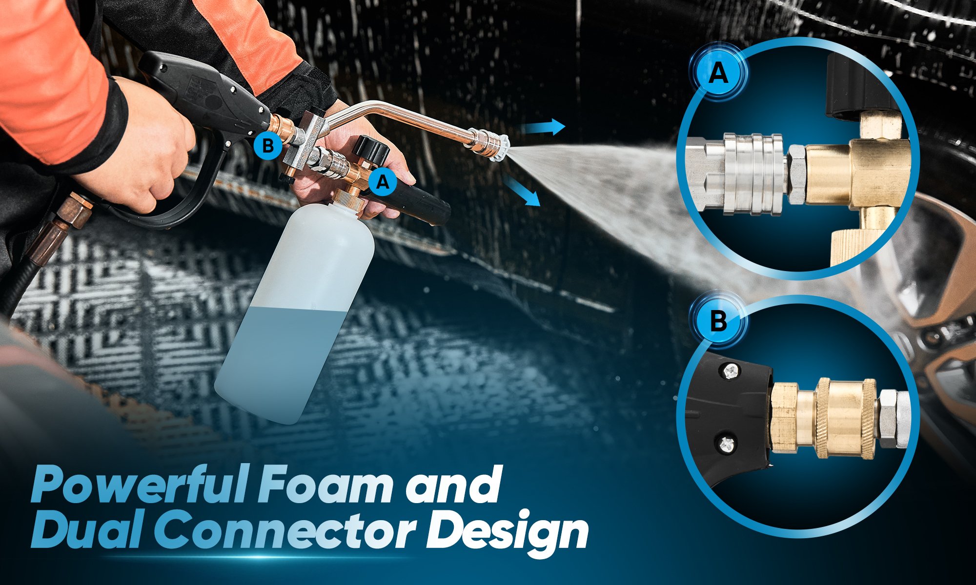Last weekend, my car was covered in mud after an off-road trip. This foam cannon hooked right up to my pressure washer—no fuss, no muss. It has a dual connector design that fits pretty much any pressure washer you have. The foam it produced was thick and rich, clinging to every nook and cranny of my car. It was like watching all that dirt just melt away!