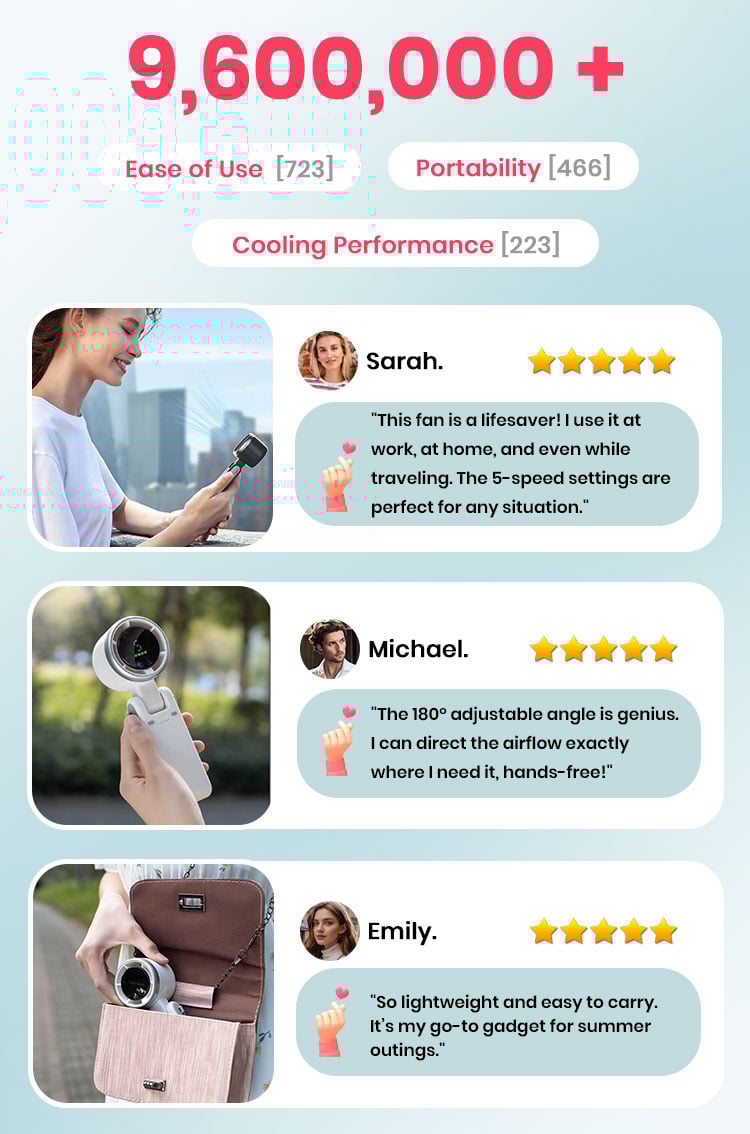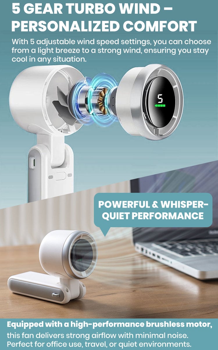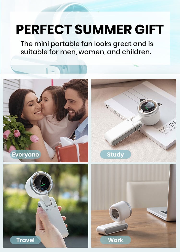 This fan has been a lifesaver during hot days! It's incredibly portable, and the 3-in-1 design is perfect. I use it as a handheld fan when I'm out, a neck fan when I'm on the go, and a desk fan for work. The 5-speed settings ensure I always have the right airflow, and the digital display is a great touch to track battery life.