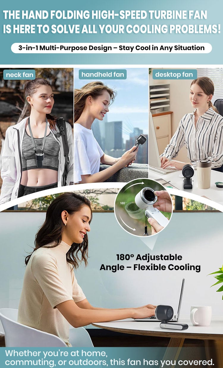The fan head rotates 180°, giving you full control over the airflow direction. Whether you’re using it handheld, as a neck fan, or on your desk, you can easily adjust it to your preferred angle.
