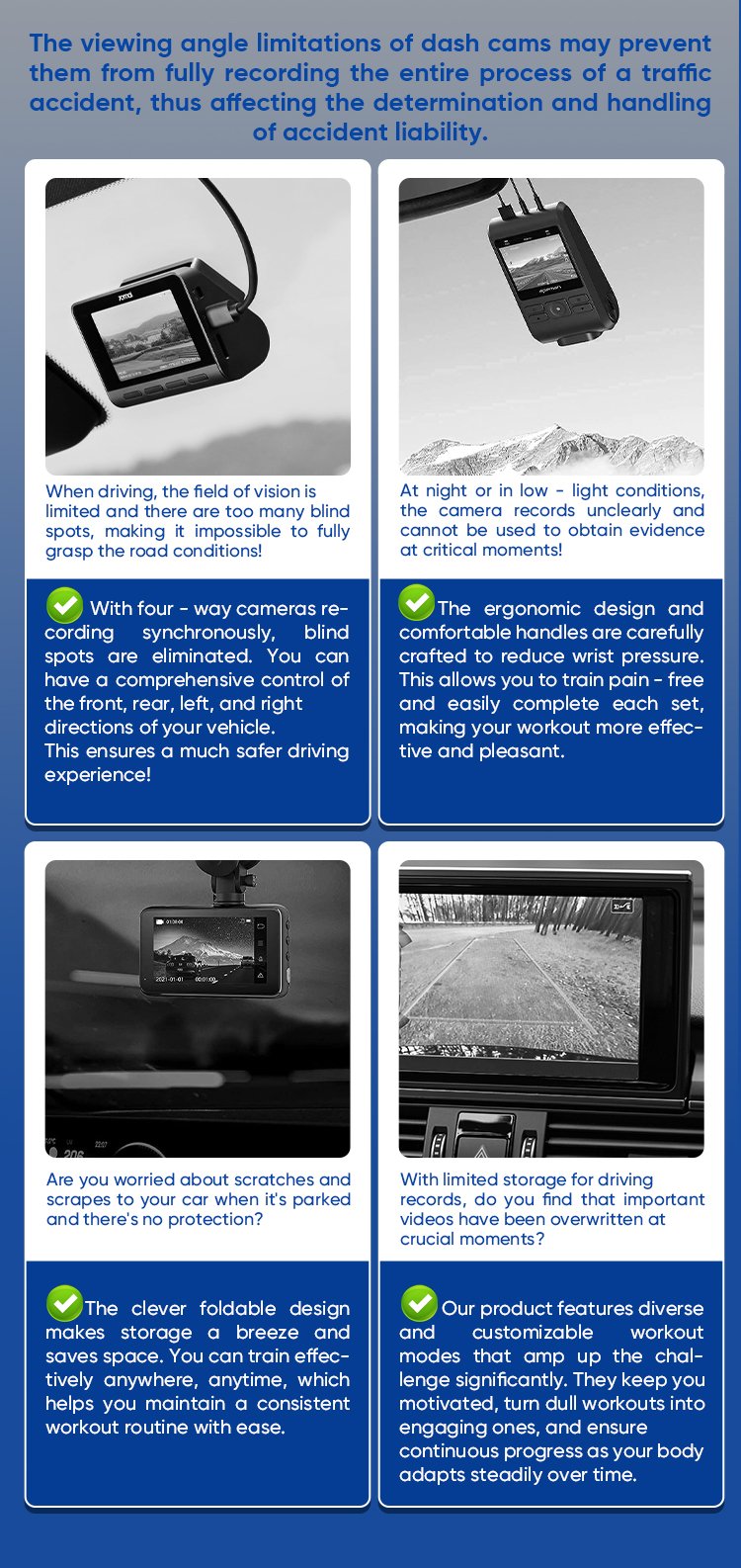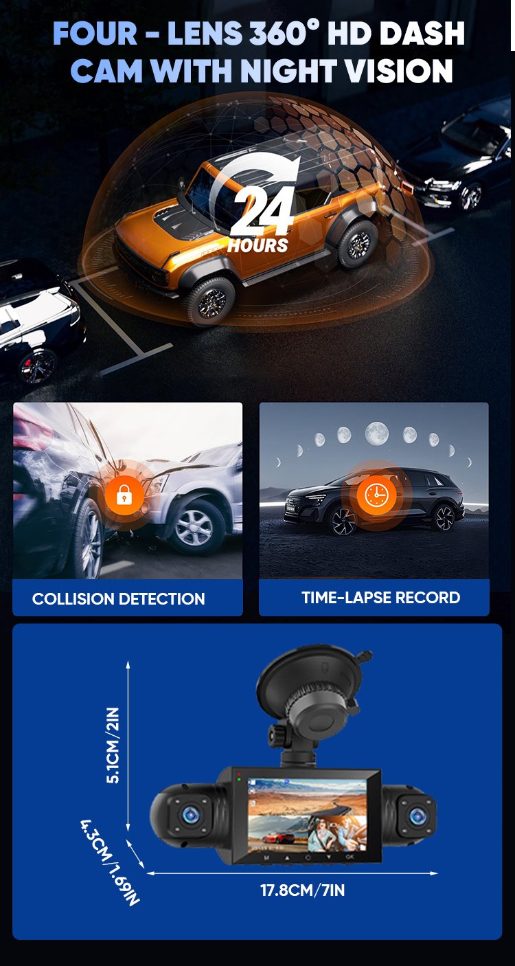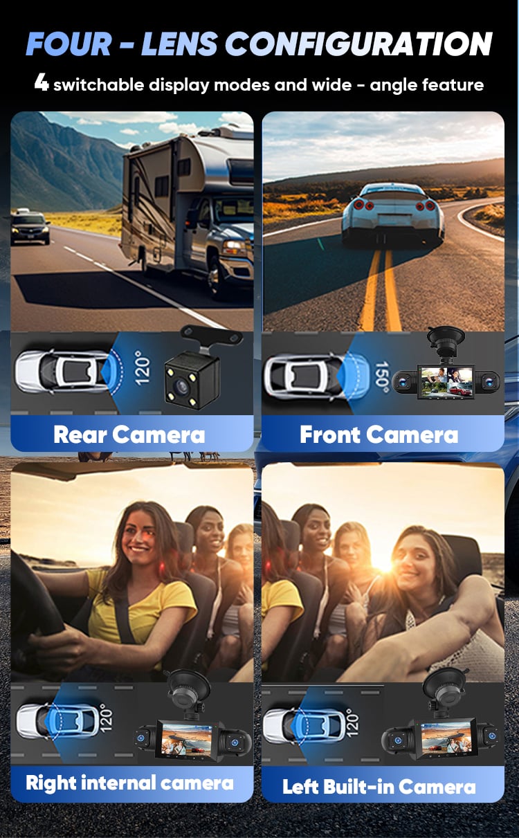 Our four - lens dash cam is more than just a recorder. It features four switchable display modes, allowing you to monitor different directions as you like. Easy to install and operate, it provides continuous and reliable recording, making it an essential companion for safe driving.