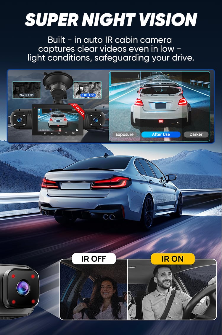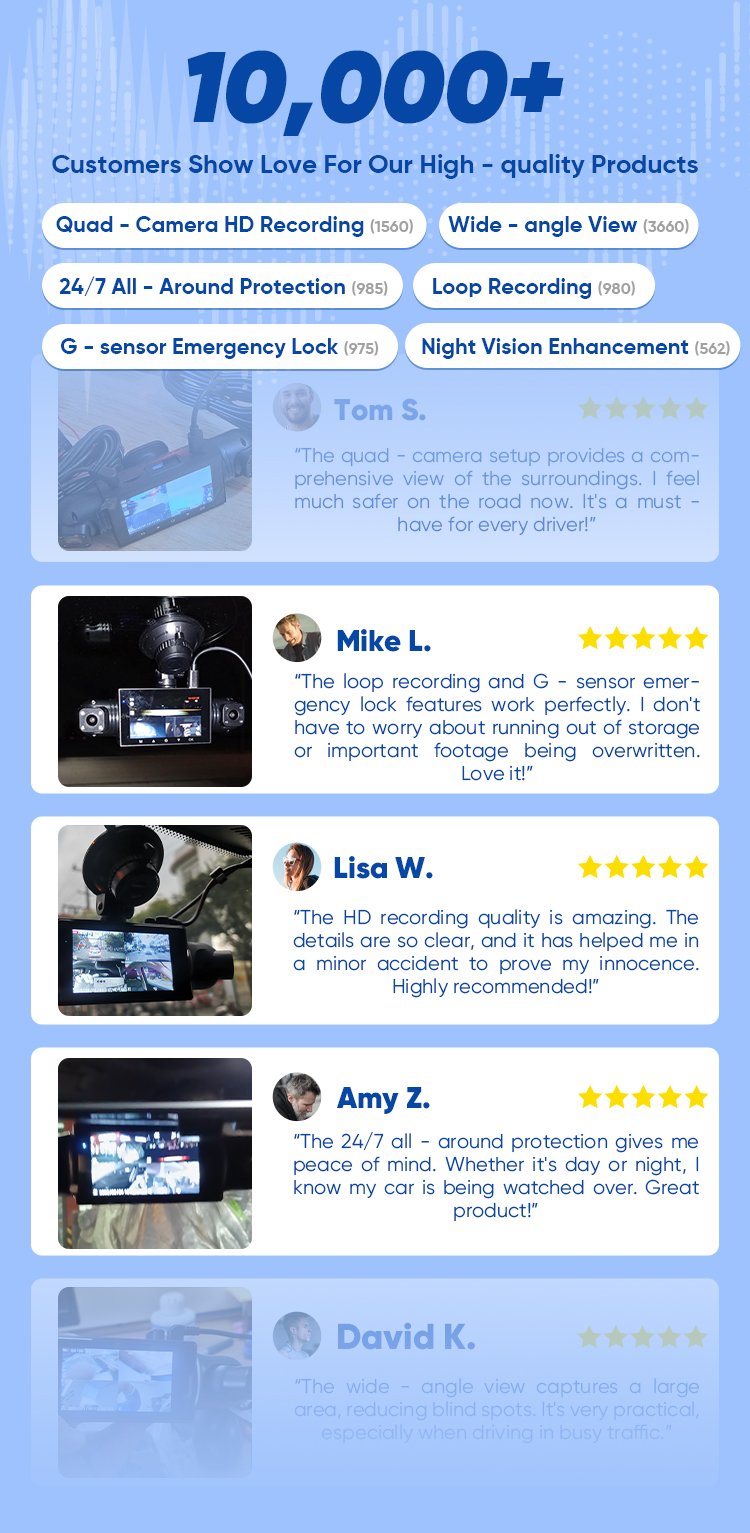Equipped with four high - definition lenses, our dash cam ensures sharp and detailed recordings day and night. Its advanced night - vision technology enables clear footage even in low - light conditions. With multiple lenses, capture every detail on the road and stay protected on every journey.