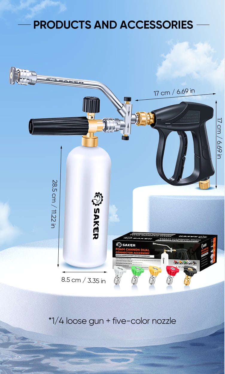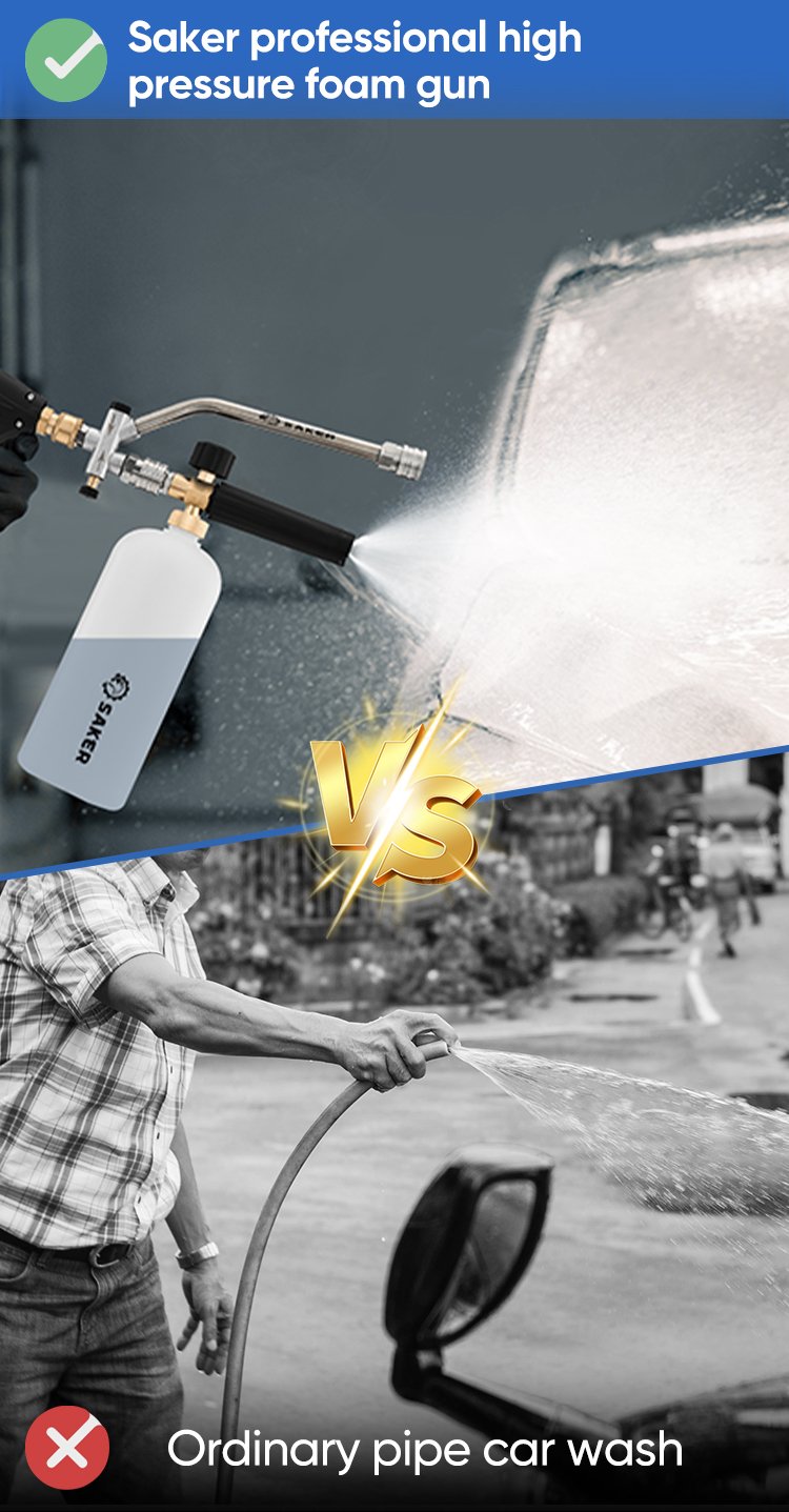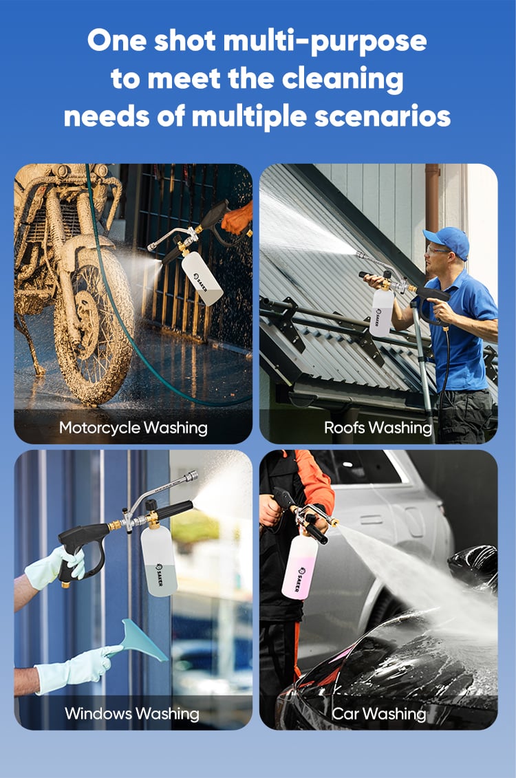 The Saker high pressure foam water gun is suitable for a variety of household cleaning tasks such as washing cars, watering flowers, cleaning floors and furniture.