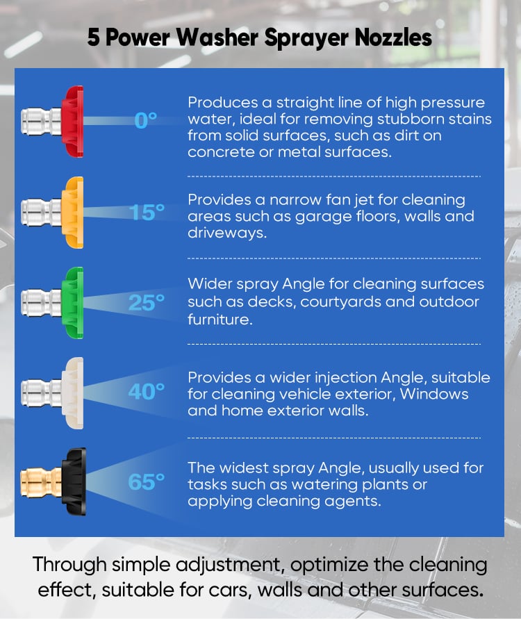 The package contains five interchangeable nozzle heads with injection angles of 0°, 15°, 25°, 40° and 65°.