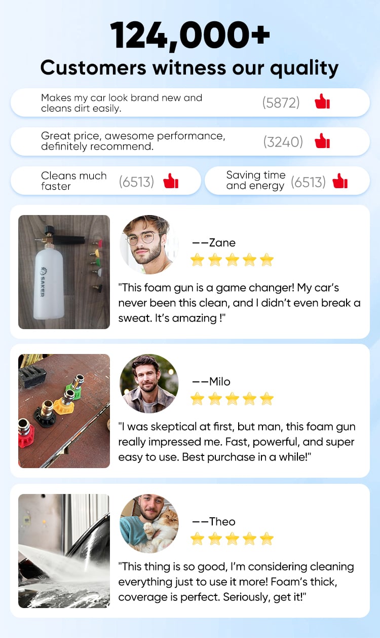 This high pressure foam water gun allows me to enjoy a professional car wash experience at home, saving time and effort, and the effect is excellent!